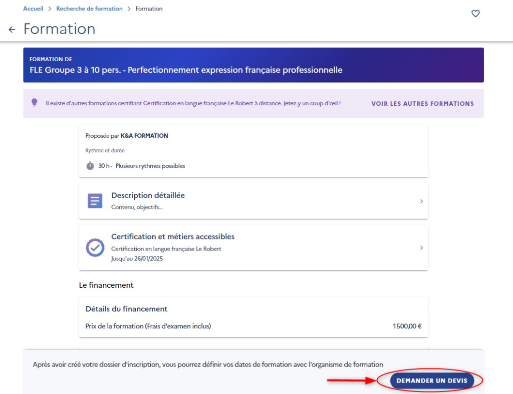 找到我们的培训课程,点击“ DEMANDER UN DEVIS(询问课程报价)”。